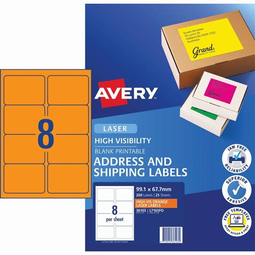 Avery High Visibility Shipping Laser Label Orange L7165FO 99.1x67.7mm 8UP 200 Labels