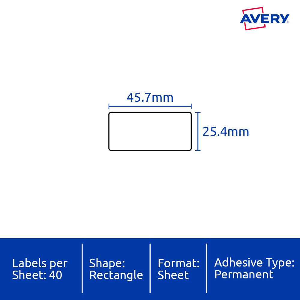 • Size: 45.7x25.4mm 400 labels, 10 sheets. 40 labels per sheet (40UP).