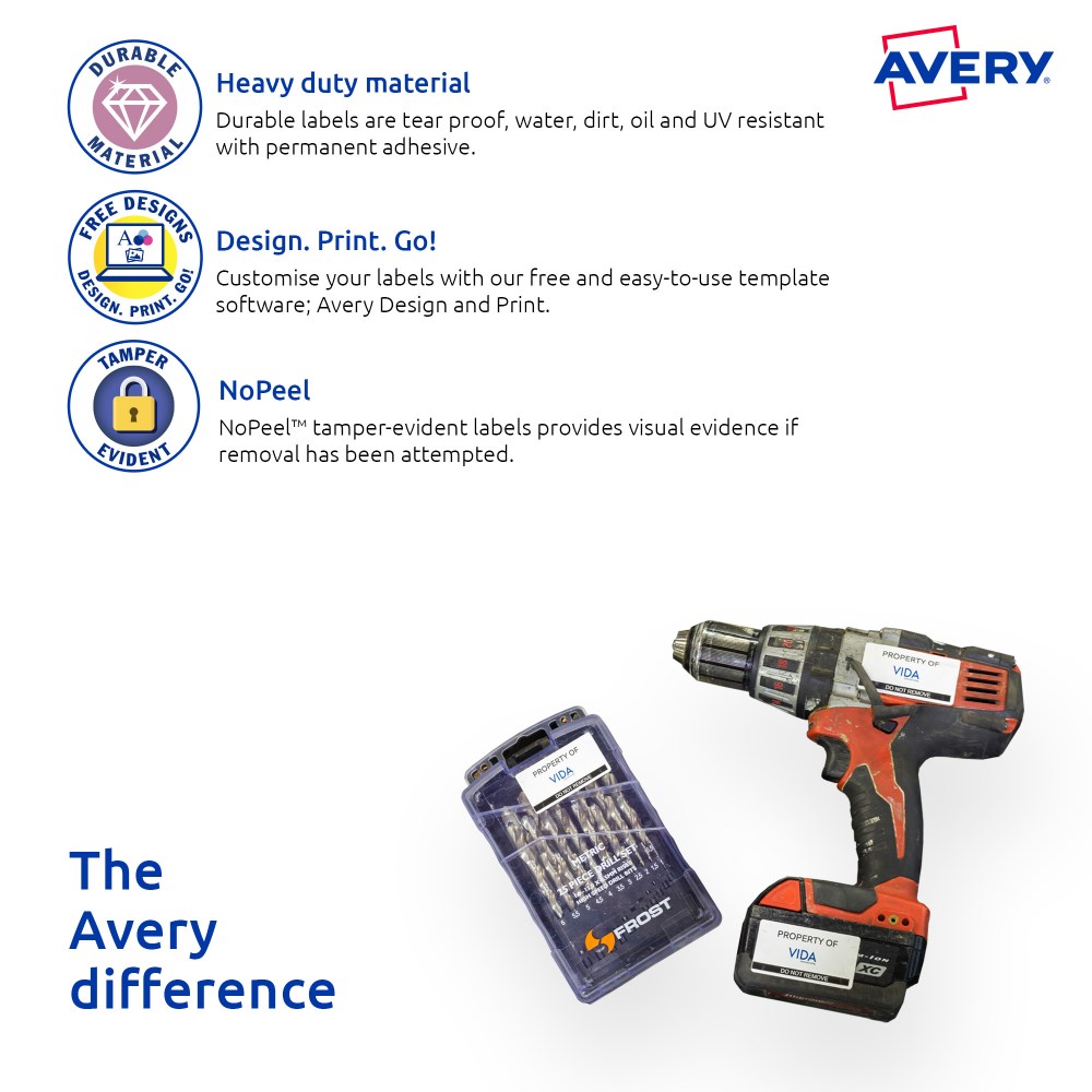 • Customise your labels with Avery Design and Print, available at averyproducts.com.au/print.
