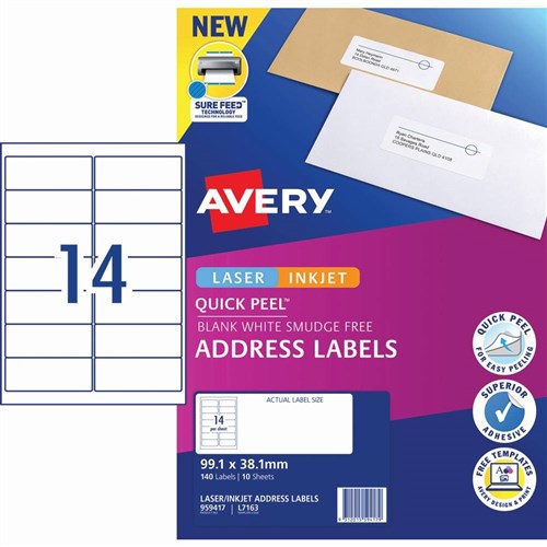 Avery Quick Peel Address Laser & Inkjet Labels White L7163 99.1 x 38mm 14UP 140 Labels