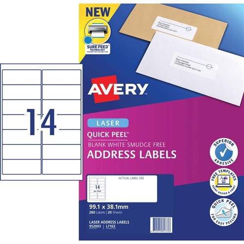 Avery Quick Peel Address Laser Labels White L7163 99.1x38.1mm 14 UP 280 Labels 20 Sheets