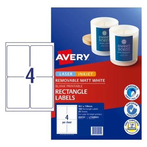 Avery Removable Labels L7169REV 99.1x139mm Rectangle Matte White 4UP 100 Labels