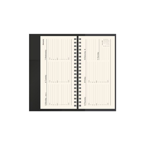 • Pen loop, lay flat opening, ribbon marker and week to view layout.