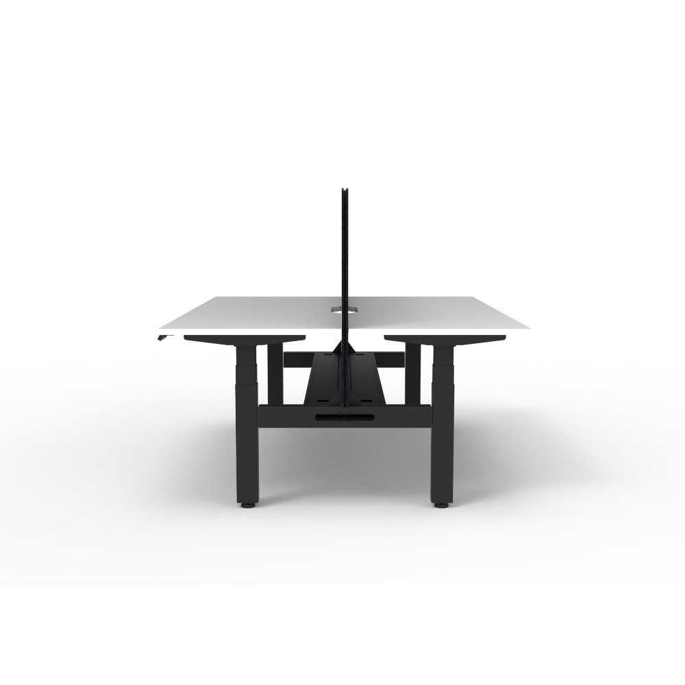 • Natural white worksurface with rigid edging and 50mm scallop cable cut out. E0 rated 25mm top. Black satin powder coat underframe. Eco screen and cable tray.