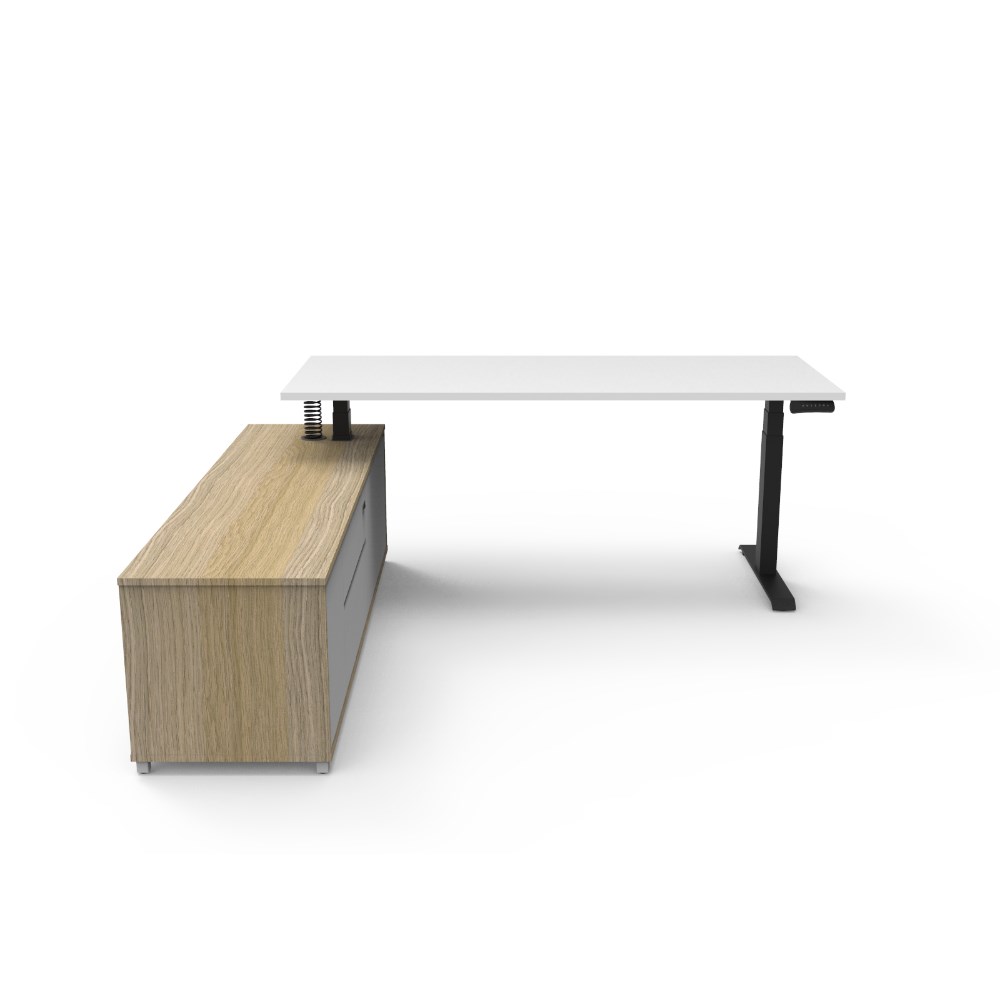 • Natural White top and Black Satin frame. Height adjustable desk with left hand side cabinet.