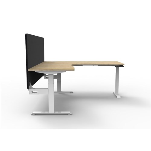 • Manual crank height adjustable corner workstation with Natural Oak top and White Satin frame, Black Eco screen.
