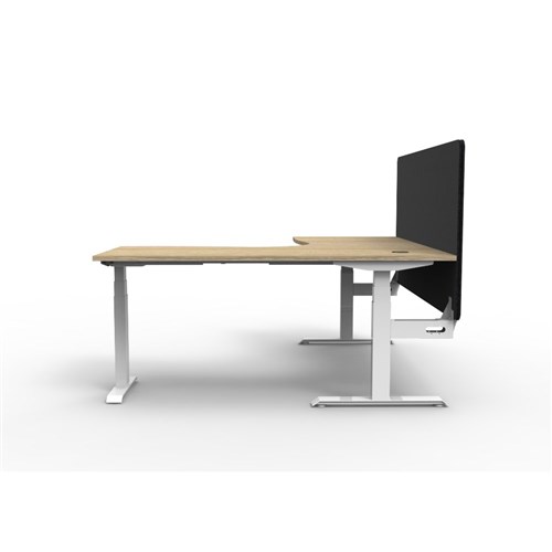 • Manual crank height adjustable corner workstation with Natural Oak top and White Satin frame, Black Eco screen.