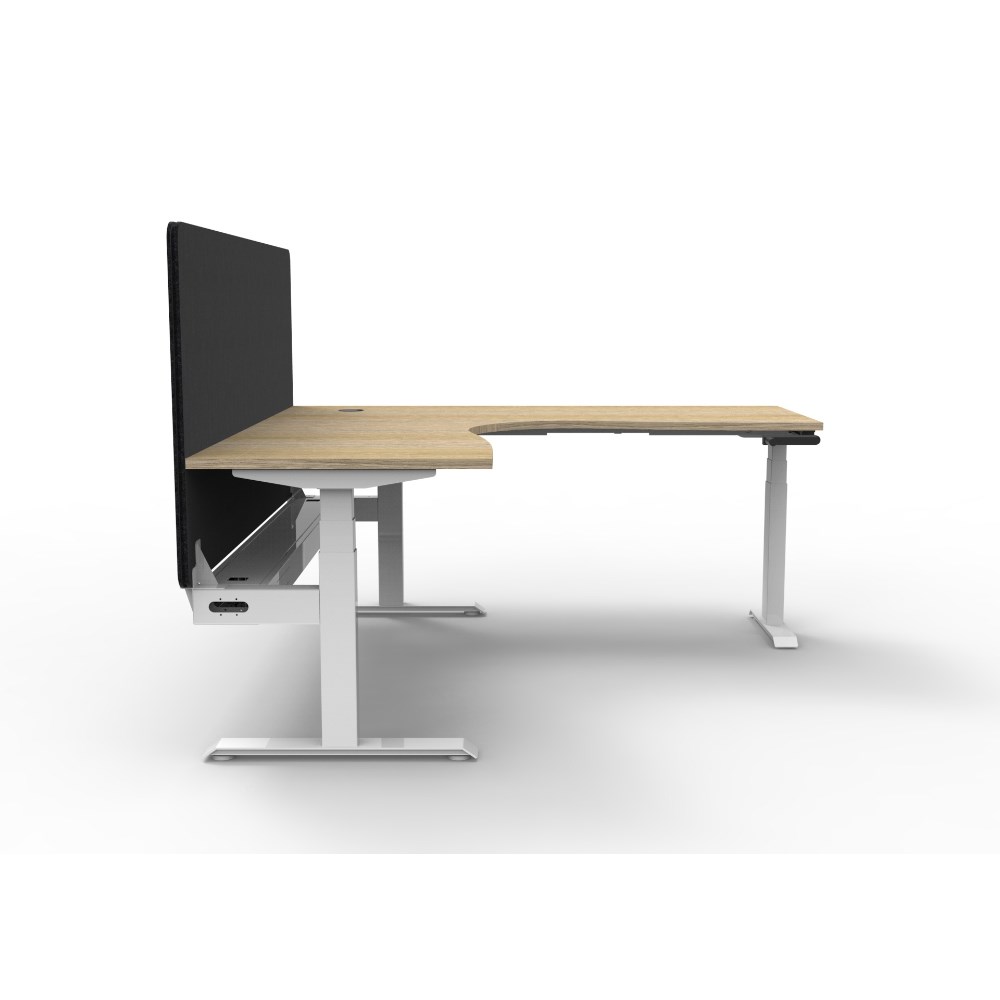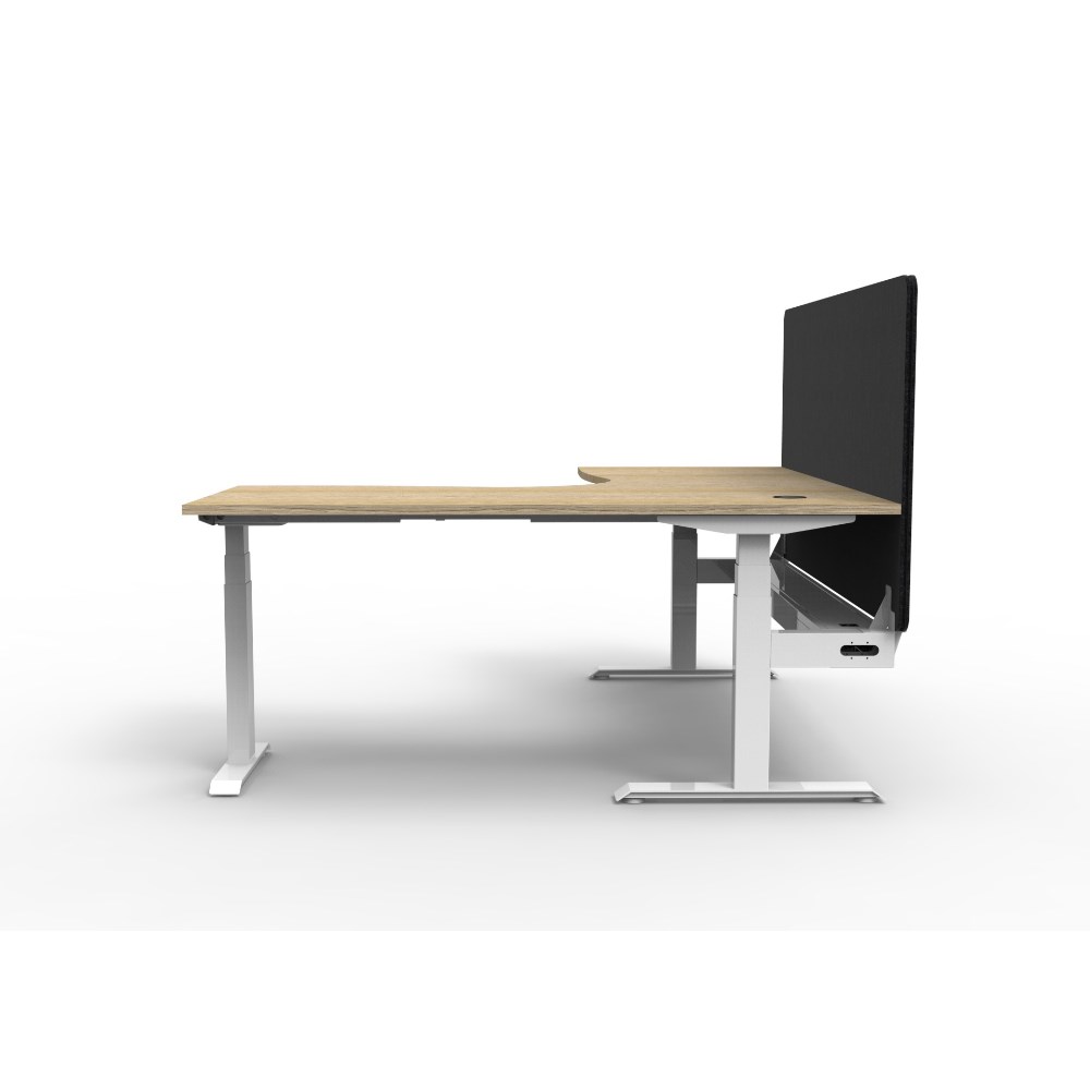 • Manual crank height adjustable corner workstation with Natural Oak top and White Satin frame, Black Eco screen and cable tray.