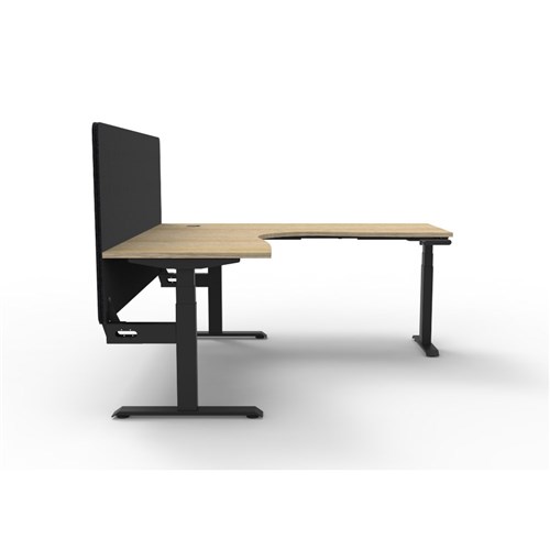 • Manual crank height adjustable corner workstation with Natural Oak top and Black Satin frame, Black Eco screen.