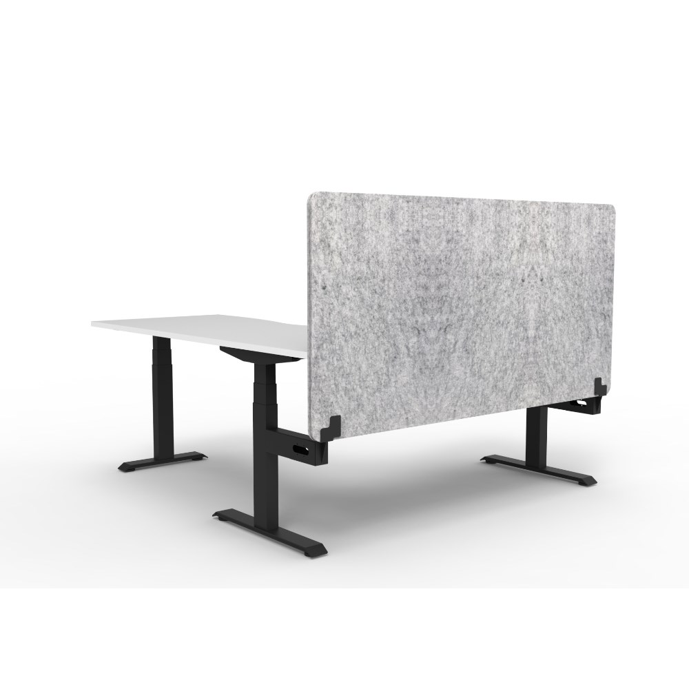 • Manual crank height adjustable corner workstation with Natural White top and Black Satin frame, Grey Eco screen.