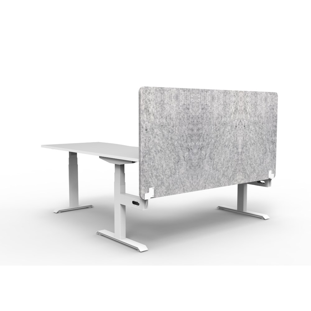 • Manual crank height adjustable corner workstation with Natural White top and White Satin frame, Grey Eco screen.