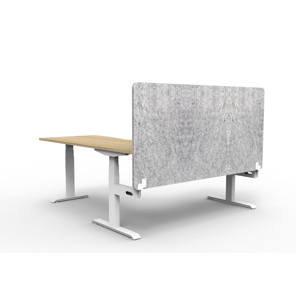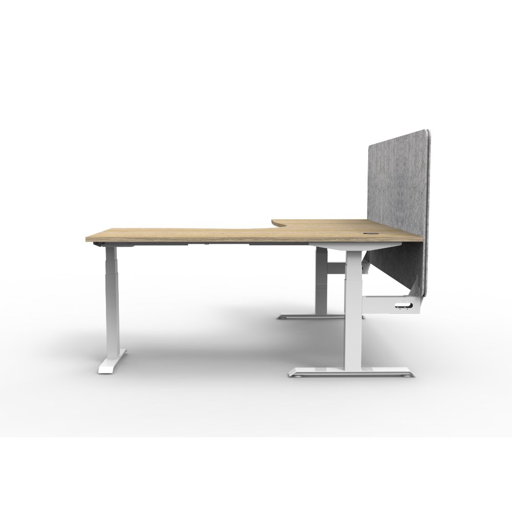 • Manual crank height adjustable corner workstation with Natural Oak top and White Satin frame, Grey Eco screen.