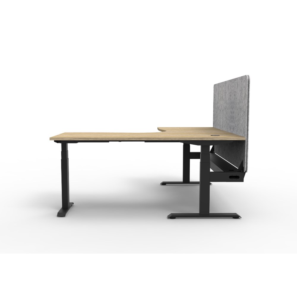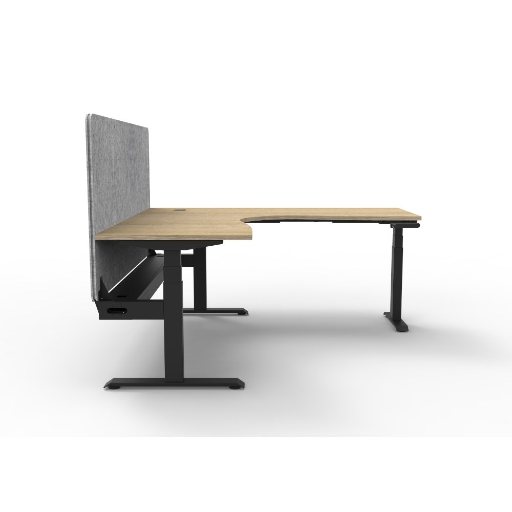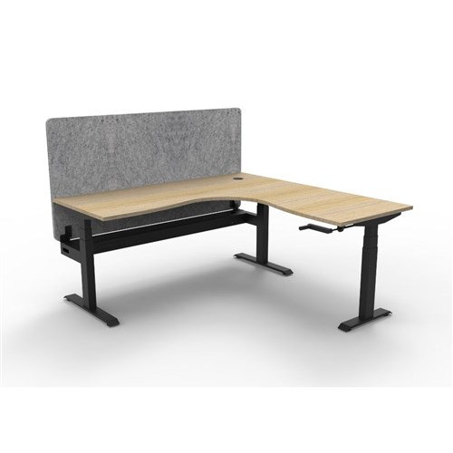 • Manual crank height adjustable corner workstation with Natural Oak top and Black Satin frame, Grey Eco screen and cable tray.