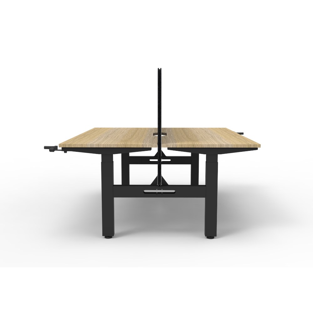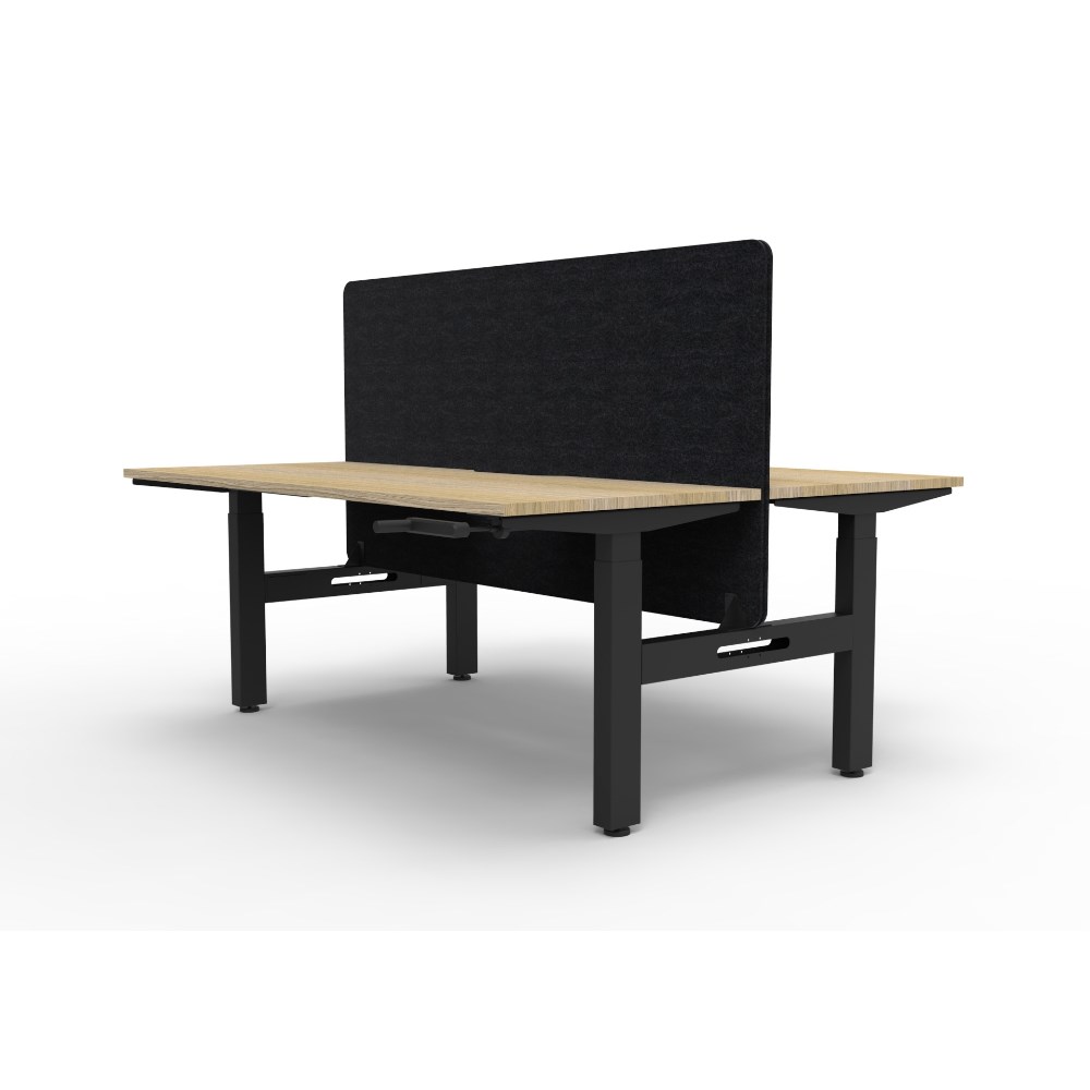 • Manual crank height adjustable 2 person back to back workstation with Natural Oak top and Black Satin frame, Black Eco screen.