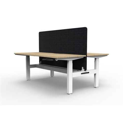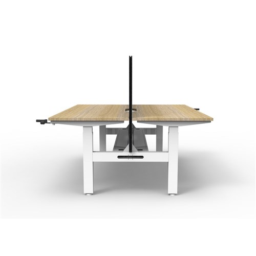 • Manual crank height adjustable 2 person back to back workstation with Natural Oak top and White Satin frame, Black Eco screen and cable tray.