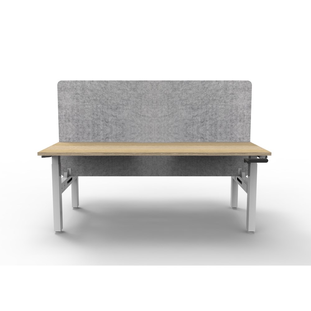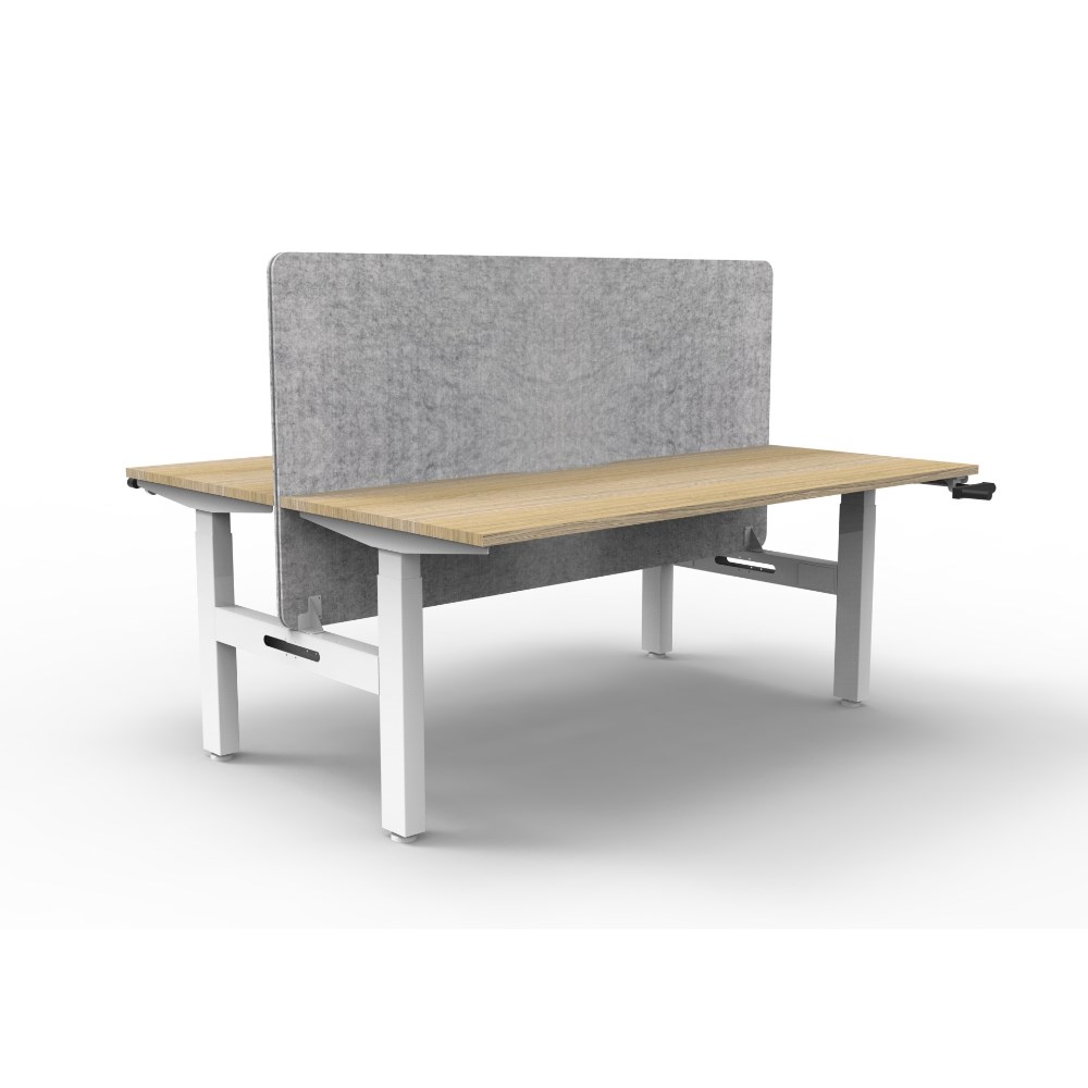 • Manual crank height adjustable single sided workstation with Natural Oak top and White Satin frame, Grey Eco screen.