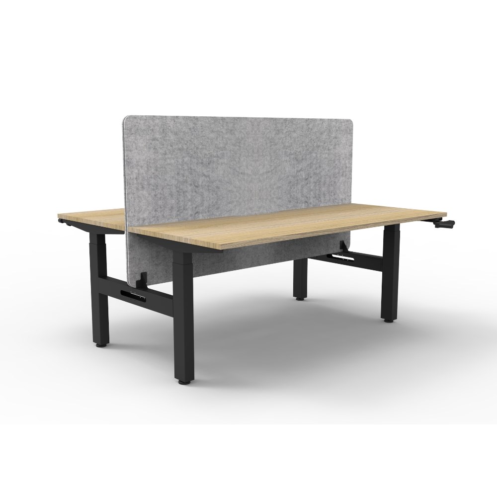 • Manual crank height adjustable single sided workstation with Natural Oak top and Black Satin frame, Grey Eco screen.