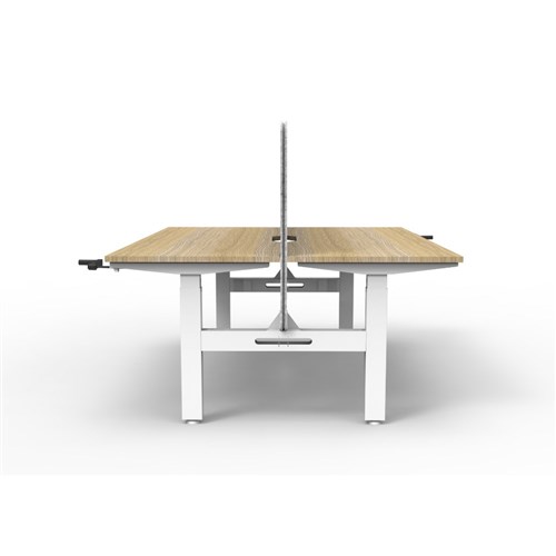 • Manual crank height adjustable 2 person back to back workstation with Natural Oak top and White Satin frame, Grey Eco screen.