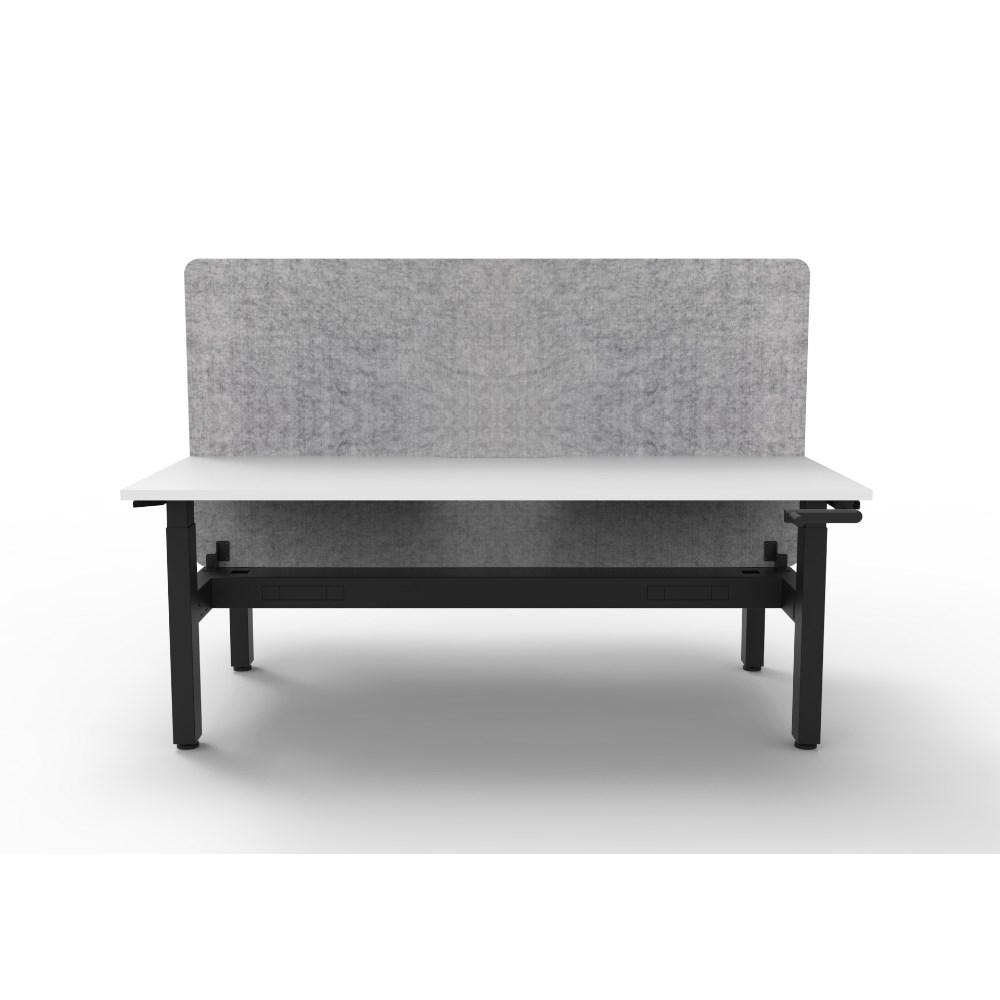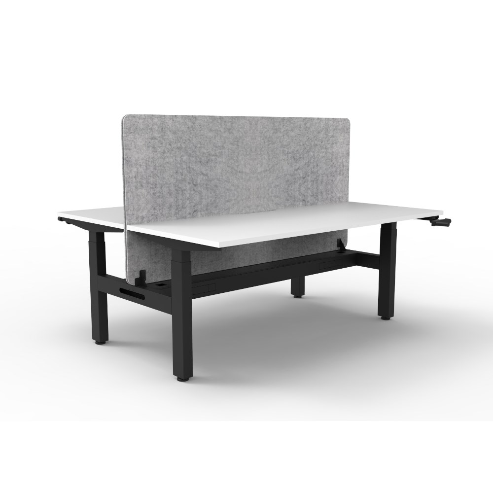 • Manual crank height adjustable 2 person back to back workstation with Natural White top and Black Satin frame, Grey Eco screen and cable tray.