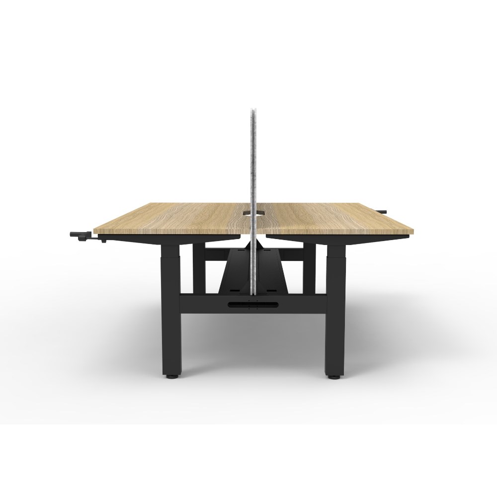 • Manual crank height adjustable 2 person back to back workstation with Natural Oak top and Black Satin frame, Grey Eco screen and cable tray.