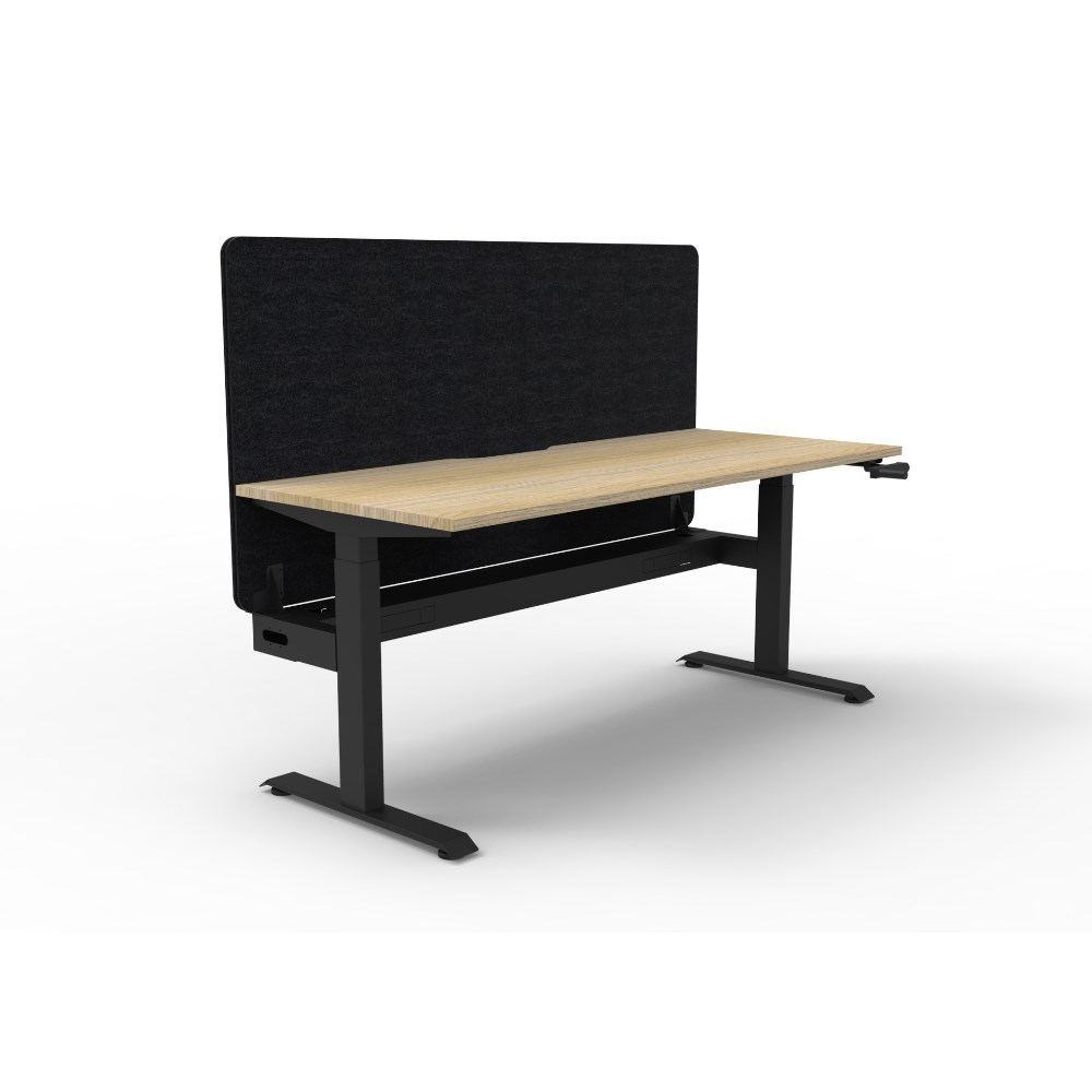 • Manual crank height adjustable single sided workstation with Natural Oak top and Black Satin frame, Black Eco screen and cable tray.