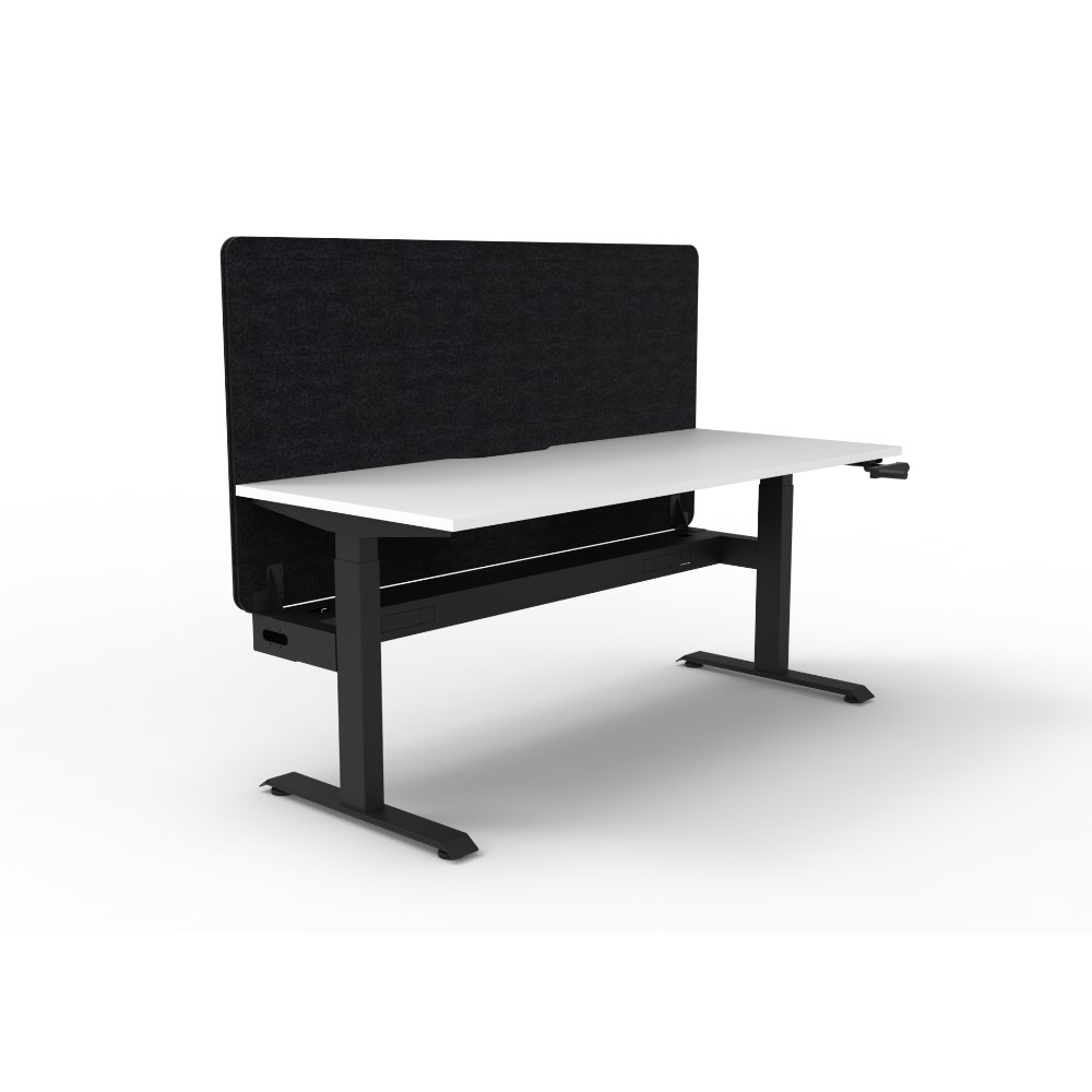 • Manual crank height adjustable single sided workstation with Natural White top and Black Satin frame, Black Eco screen and cable tray.