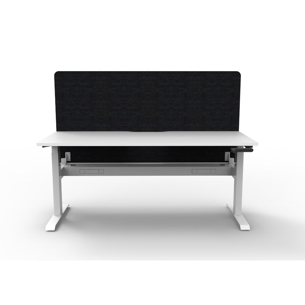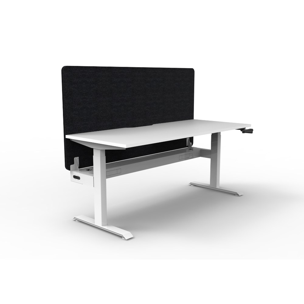 • Manual crank height adjustable single sided workstation with Natural White top and White Satin frame, Black Eco screen and cable tray.