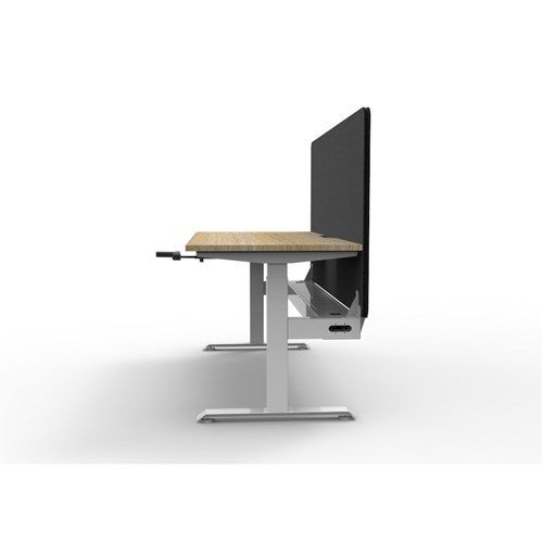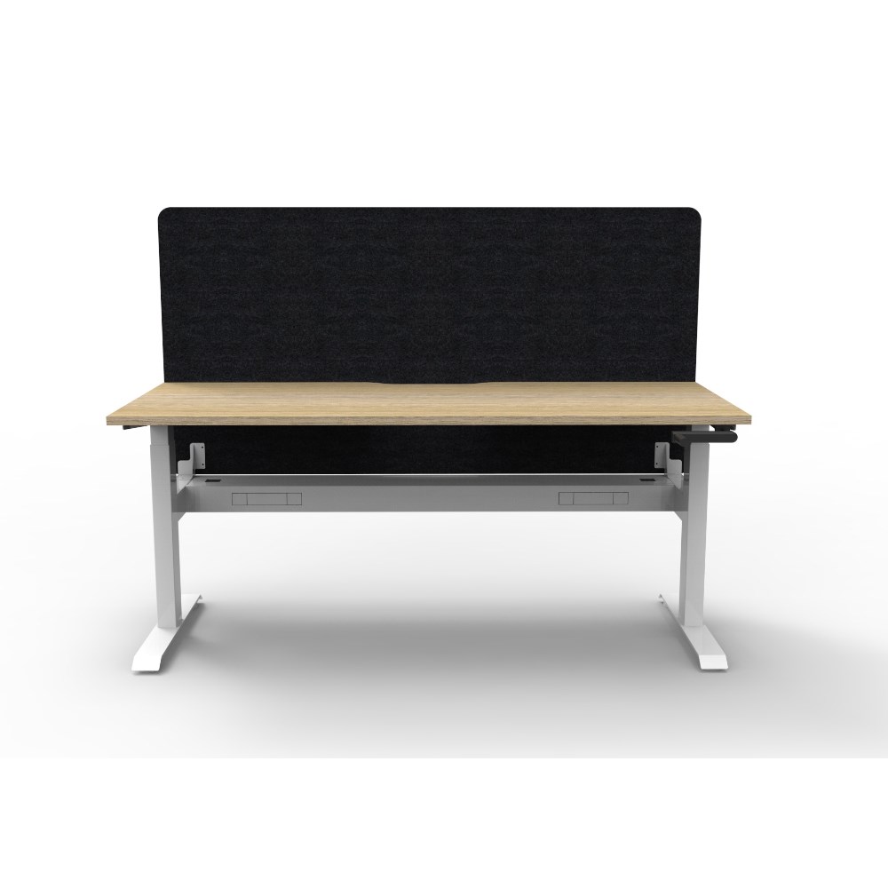 • Manual crank height adjustable single sided workstation with Natural Oak top and White Satin frame, Black Eco screen and cable tray.