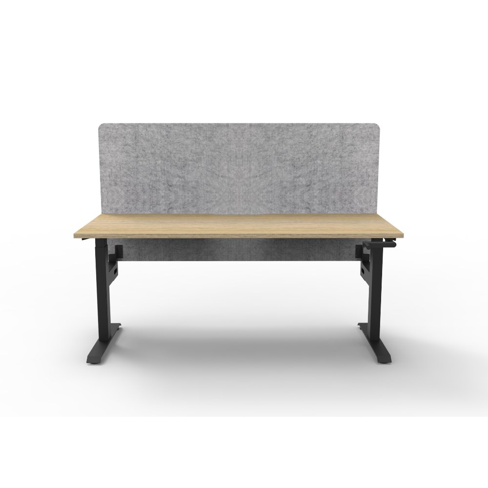 • Manual crank height adjustable single sided workstation with Natural Oak top and Black Satin frame, Grey Eco screen.