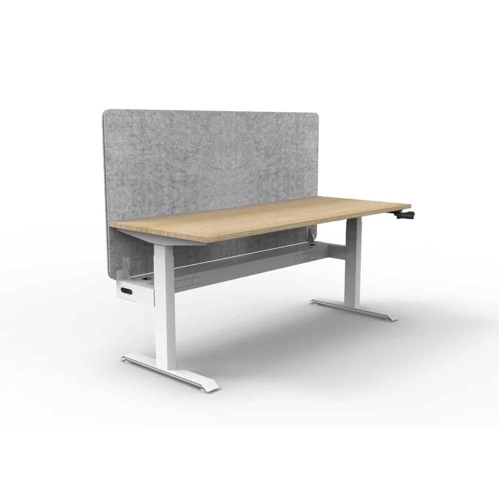 • Manual crank height adjustable single sided workstation with Natural Oak top and White Satin frame, Grey Eco screen and cable tray.