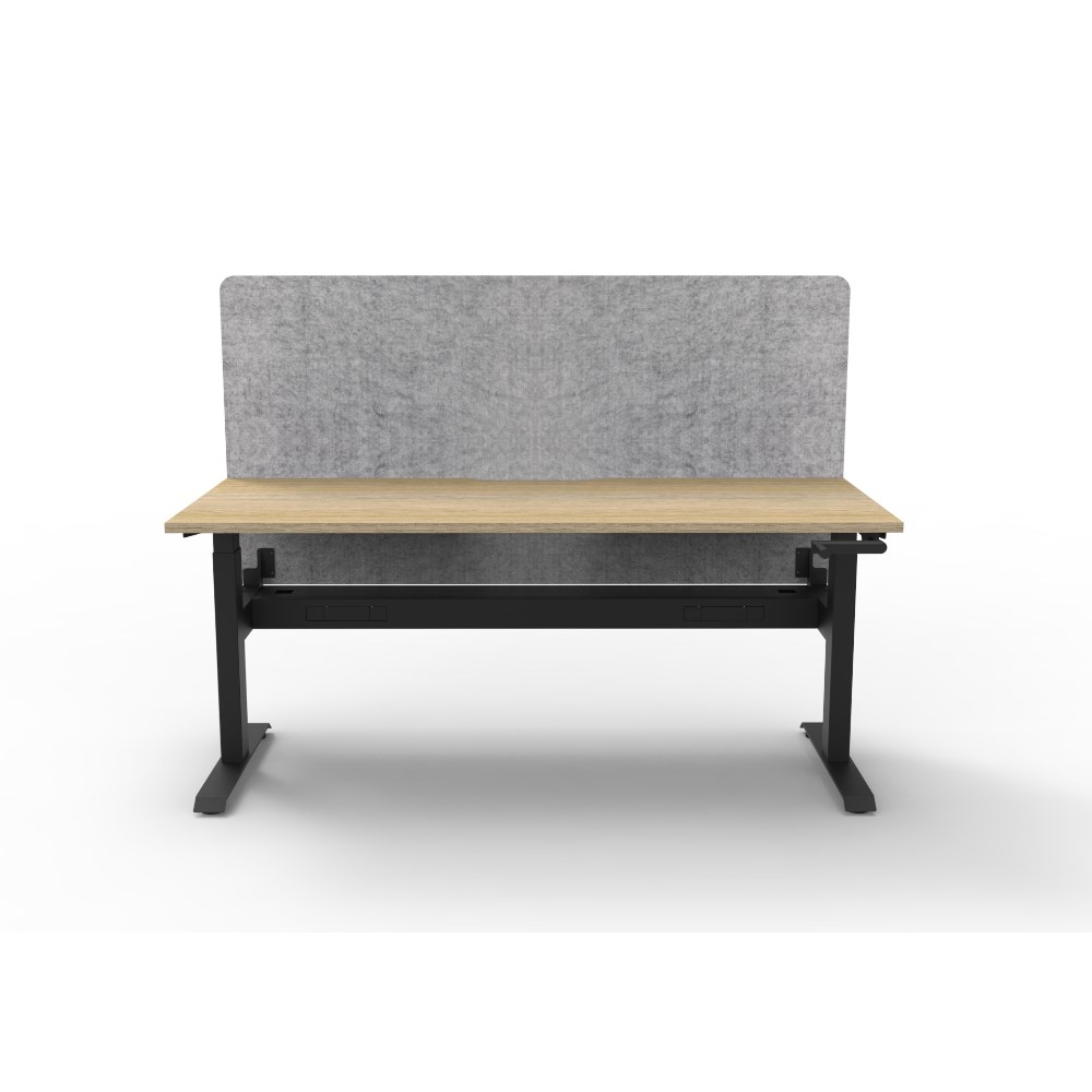 • Manual crank height adjustable single sided workstation with Natural Oak top and Black Satin frame, Grey Eco screen and cable tray.