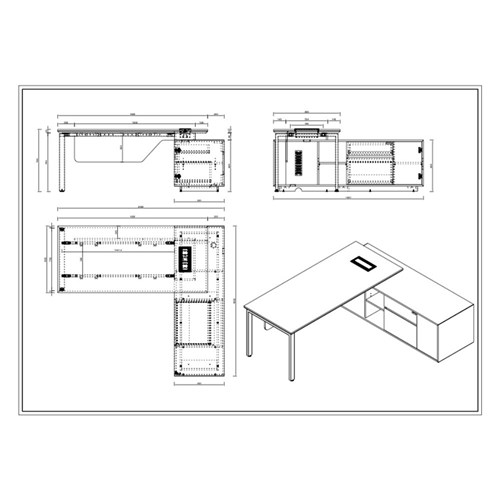 • Table Top Thickness: 43mm. Shark nose edge profile and integrated in desk cable tidy box with brush trip dualway lid.