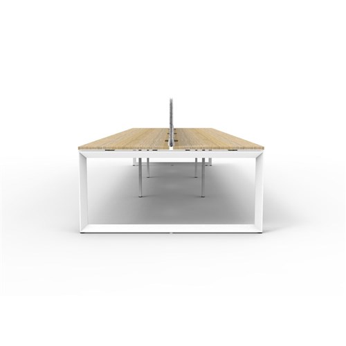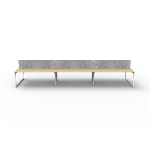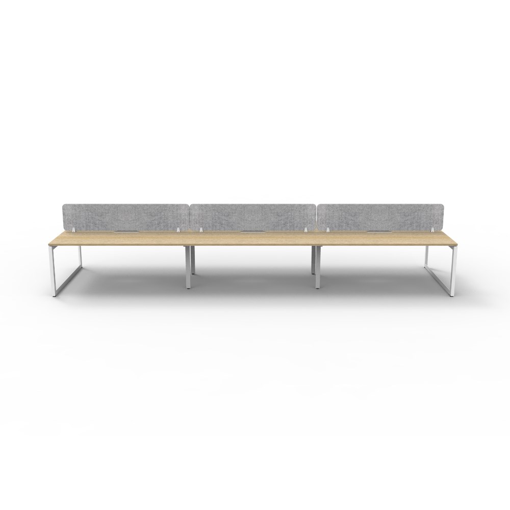 • 6 person double sided workstation with Natural Oak top and White Satin frame, Grey Eco screen.