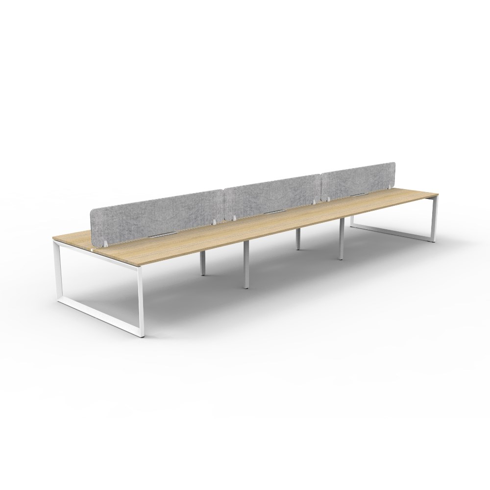 • 6 person double sided workstation with Natural Oak top and White Satin frame, Grey Eco screen.
