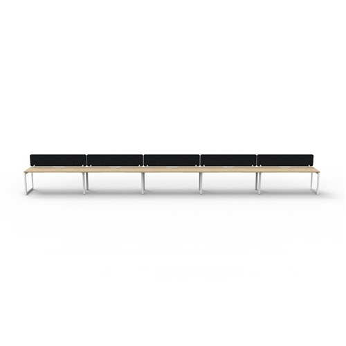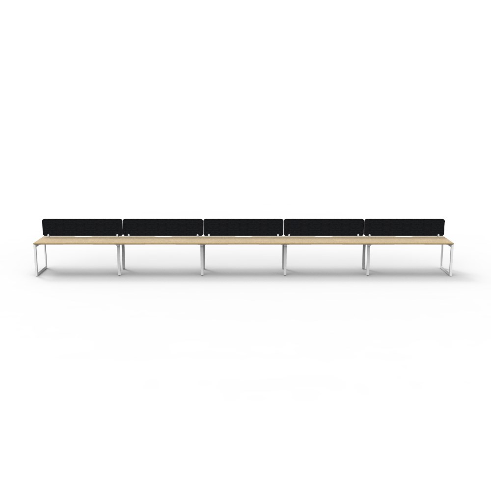 • 5 person single sided workstation with Natural Oak top and White Satin frame, Black Eco screen.