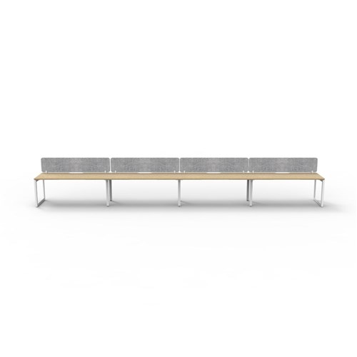 • 4 person single sided workstation with Natural Oak top and White Satin frame, Grey Eco screen.