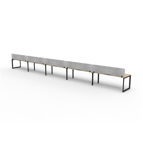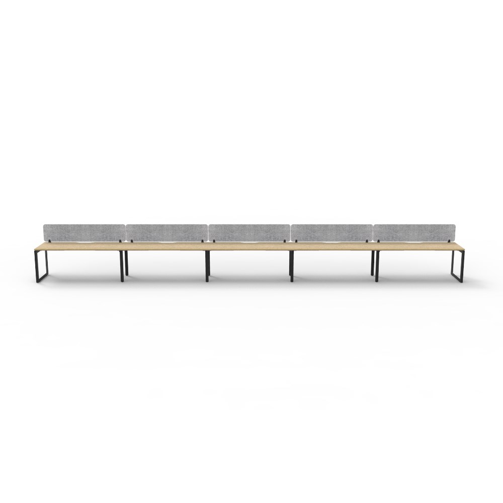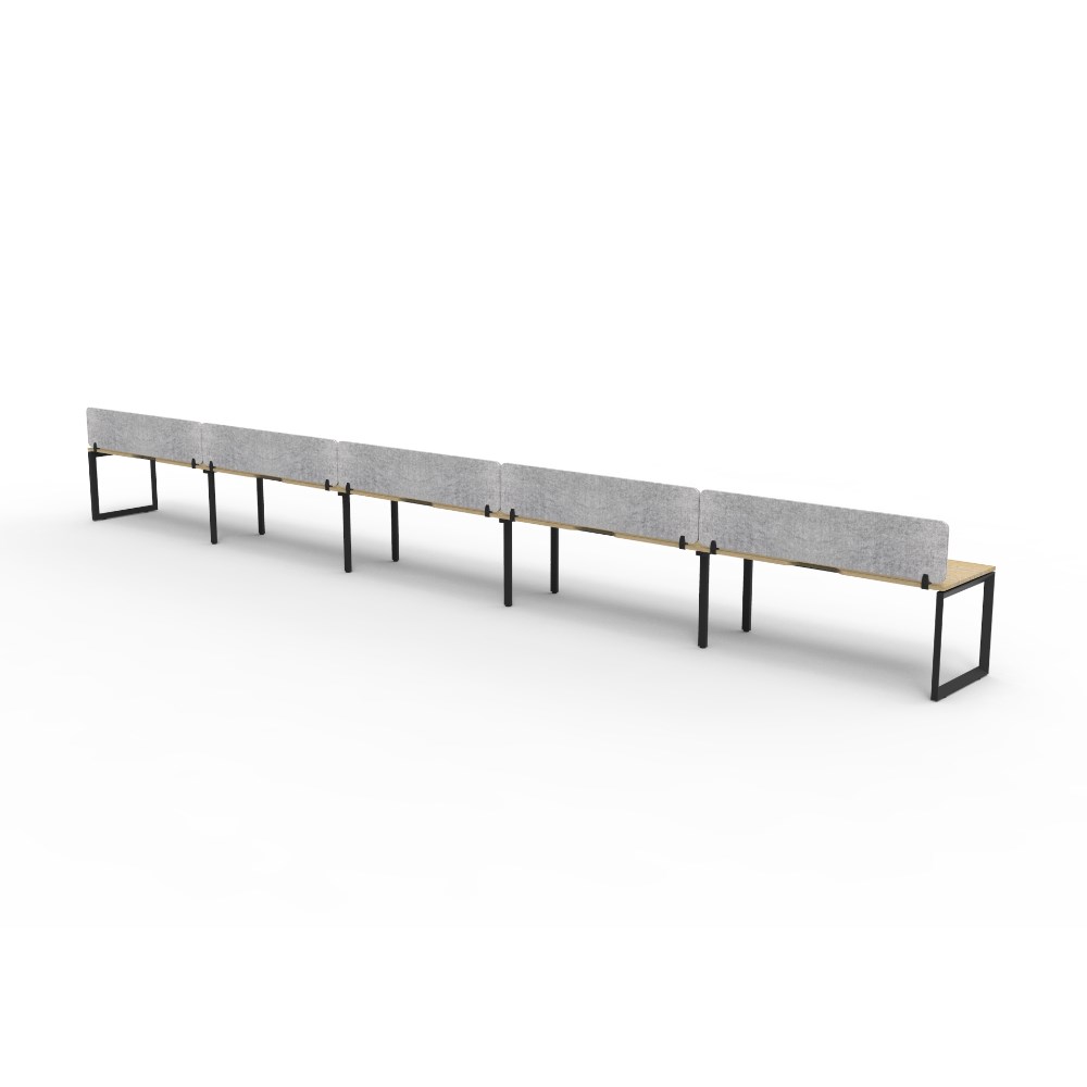 • 5 person single sided workstation with Natural Oak top and Black Satin frame, Grey Eco screen.