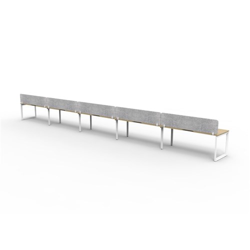• 5 person single sided workstation with Natural Oak top and White Satin frame, Grey Eco screen.