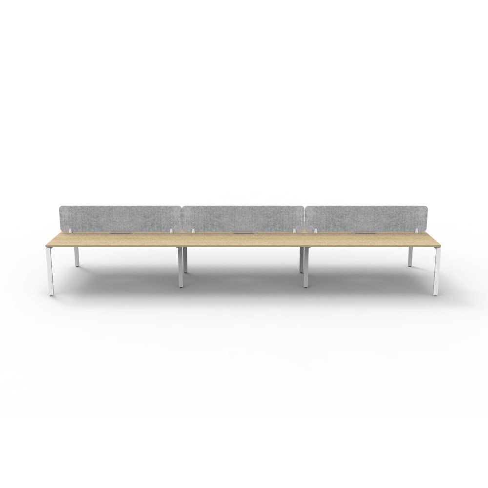 • 6 person double sided workstation with Natural Oak top and White Satin frame, Grey Eco screen.