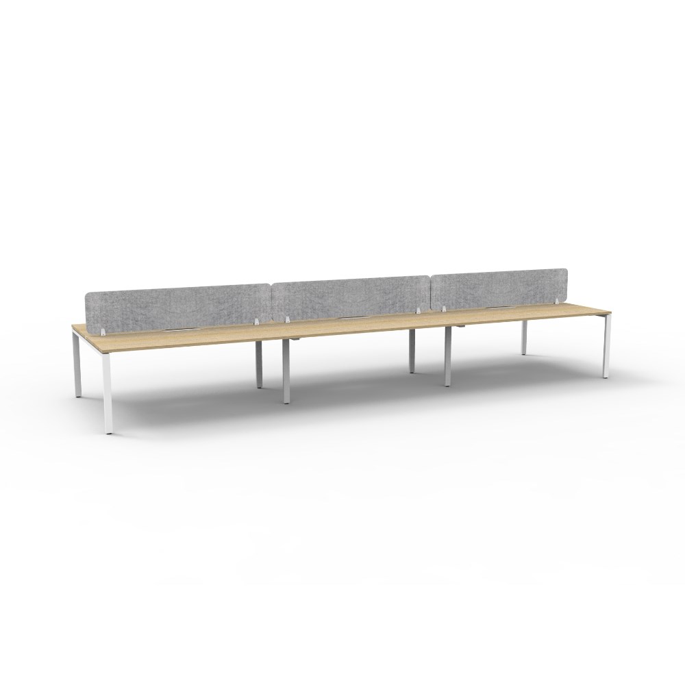 • 6 person double sided workstation with Natural Oak top and White Satin frame, Grey Eco screen.