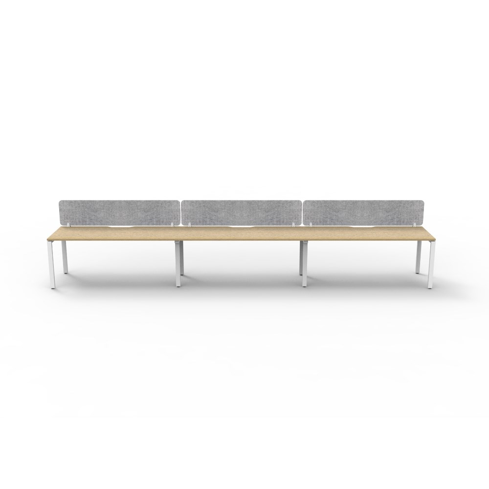 • 3 person single sided workstation with Natural Oak top and White Satin frame, Grey Eco screen.