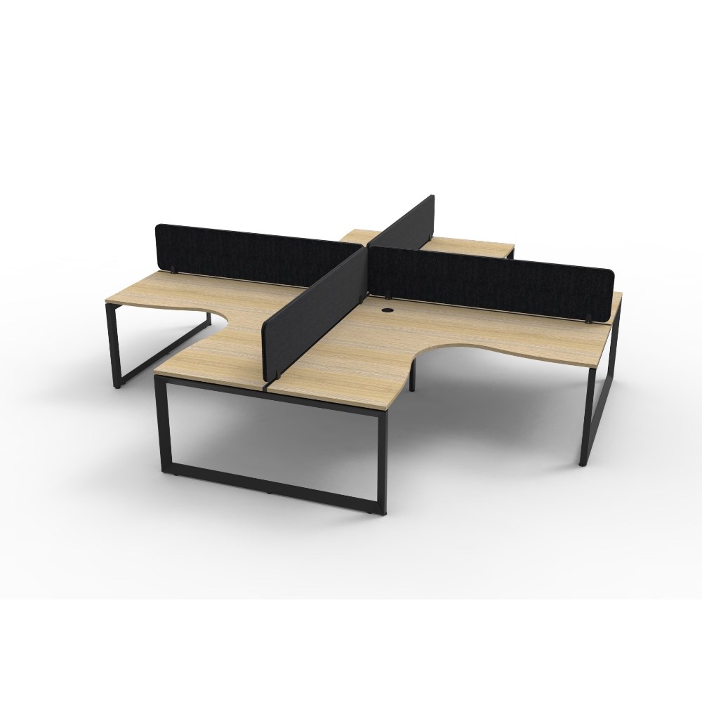 • 4 person corner workstation POD with Natural Oak top and Black Satin frame, Black Eco screen.