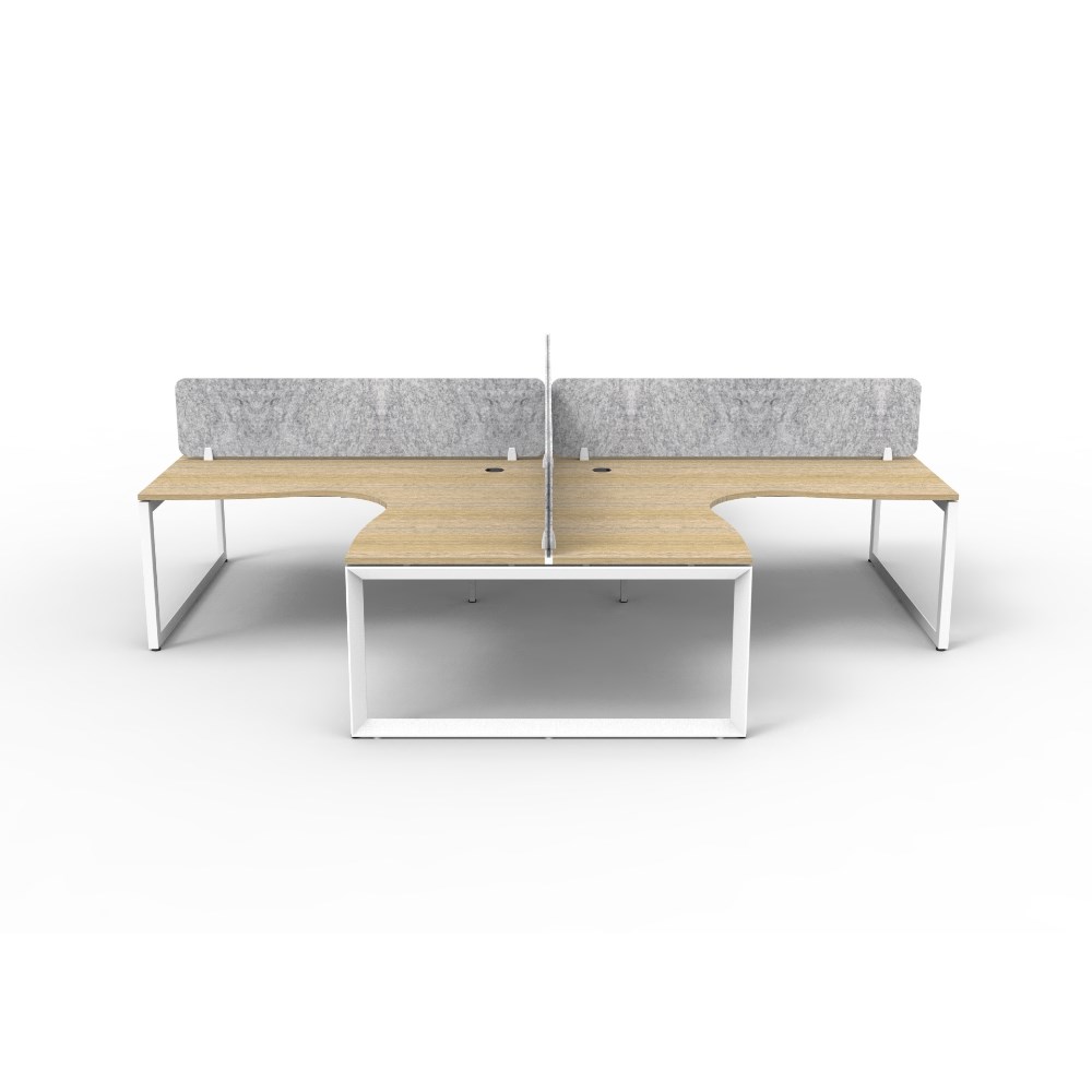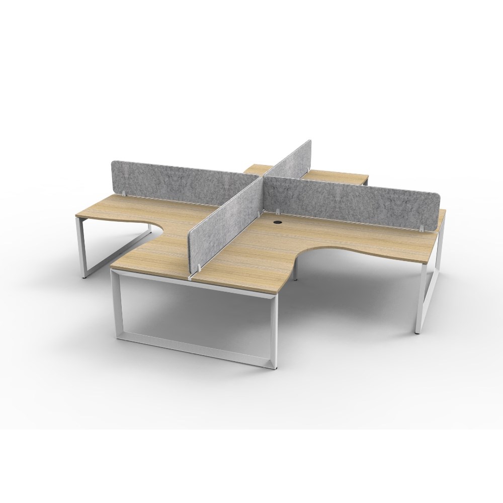 • 4 person corner workstation POD with Natural Oak top and White Satin frame, Grey Eco screen.