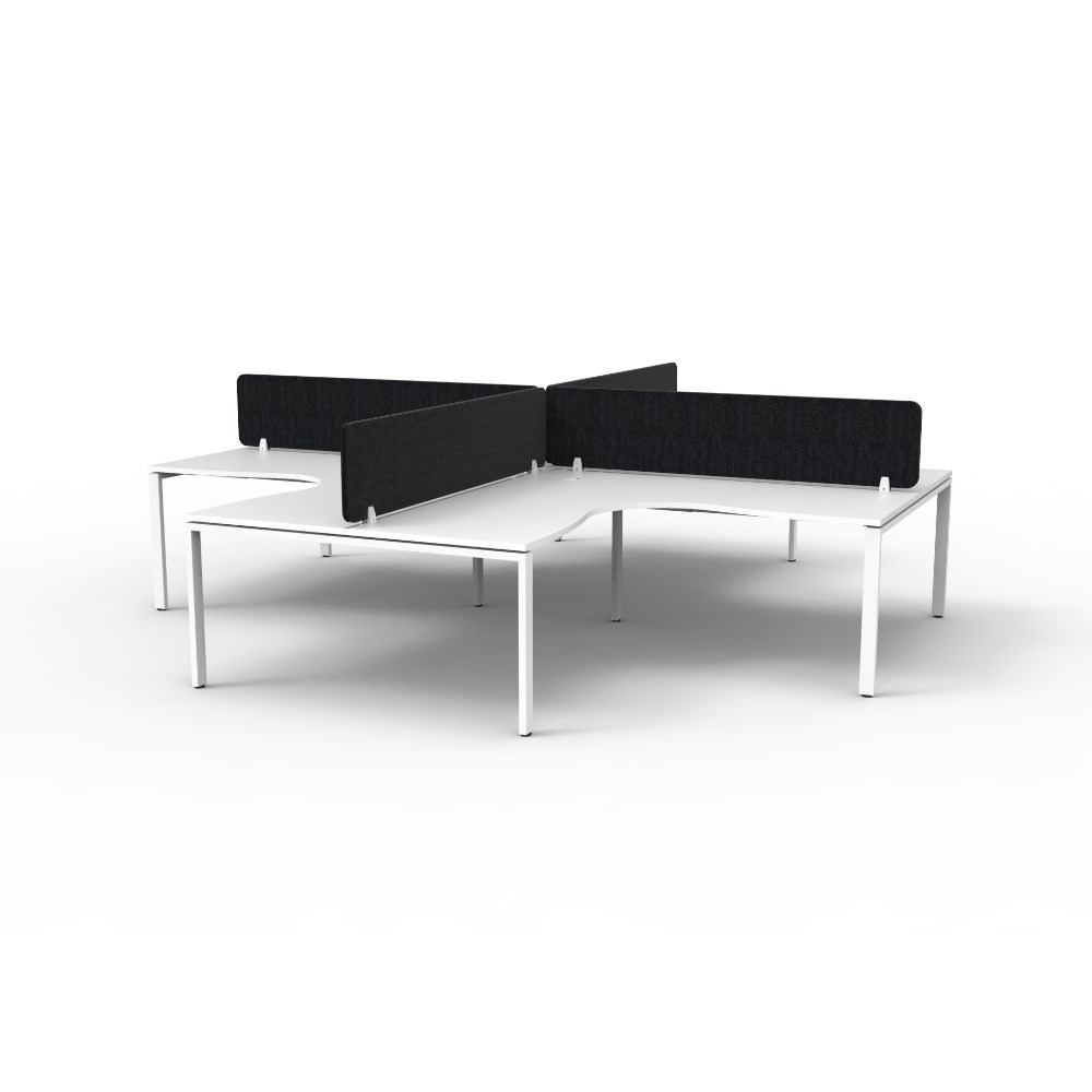 • 4 person corner workstation POD with White top and White Satin frame, Black Eco screen.