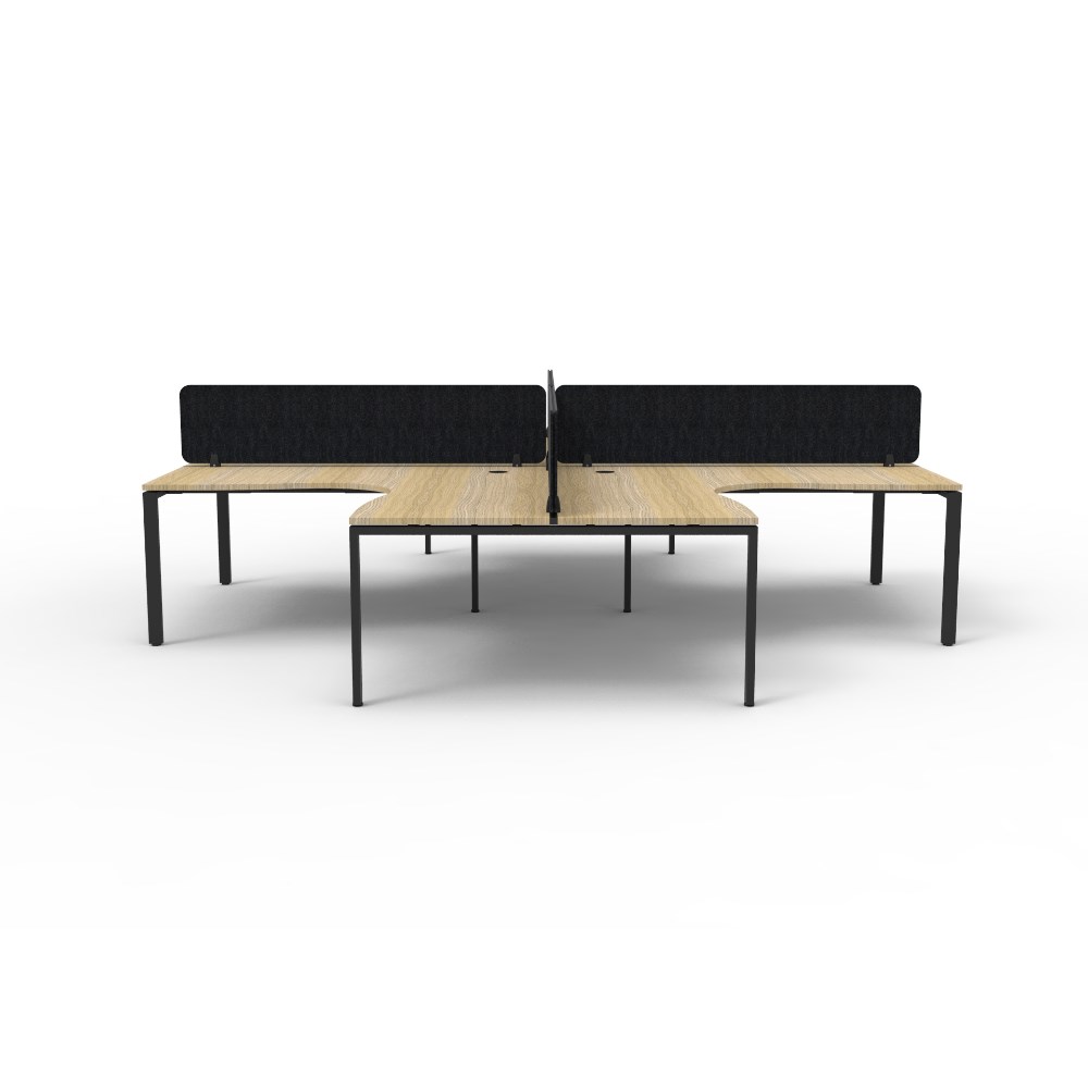 • 4 person corner workstation POD with Natural Oak top and Black Satin frame, Black Eco screen.