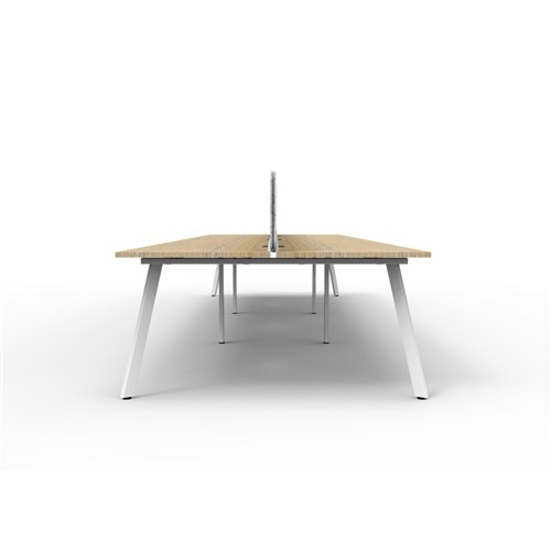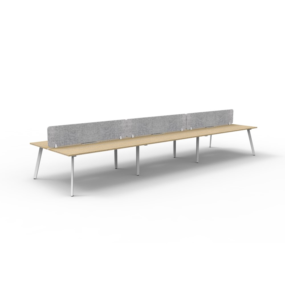 • 6 person double sided workstation with Natural Oak top and White Satin frame, Grey Eco screen.