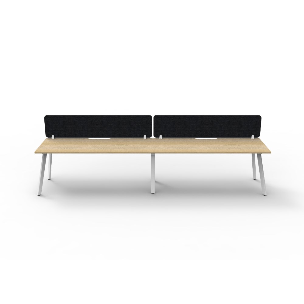 • 2 person single sided workstation with Natural Oak top and White Satin frame, Black Eco screen.