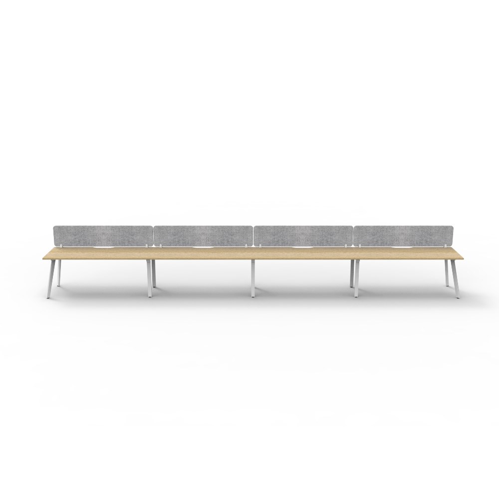 • 4 person single sided workstation with Natural Oak top and White Satin frame, Grey Eco screen.