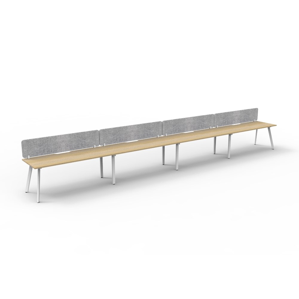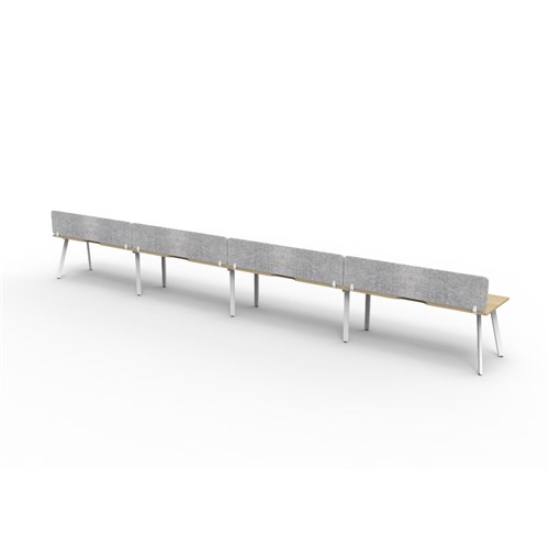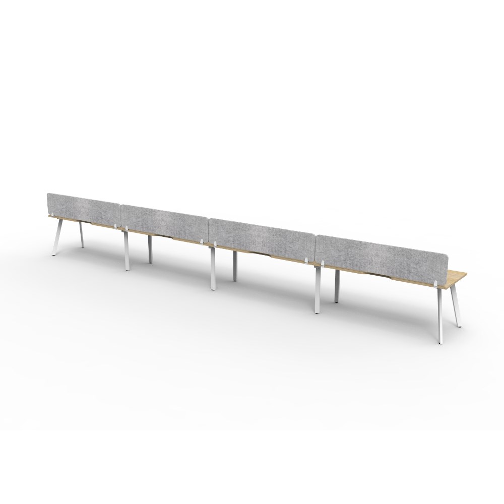 • 4 person single sided workstation with Natural Oak top and White Satin frame, Grey Eco screen.
