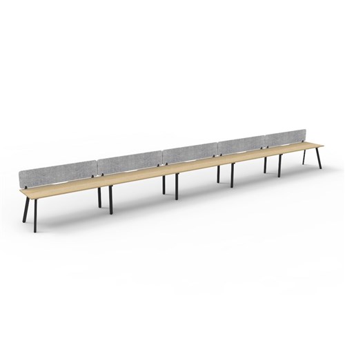 • 5 person single sided workstation with Natural Oak top and Black Satin frame, Grey Eco screen.